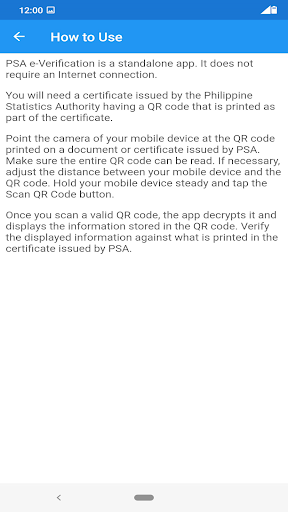 Philippine Statistics Authority (PSA) QR reader validation app that can be used to scan the QR code printed as part of a PSA certificate, decode and display the stored information by a smartphone so that the app user can verify the displayed information against what is printed in the certificate.