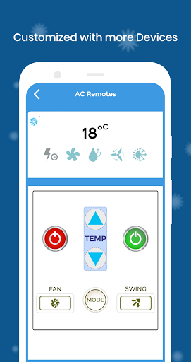 Universal all Air Conditioner - Remote Control is a tool for setting your temperature value on any air conditioner in range of your mobile phone. This app will turn your Android device into universal remote for air conditioning. It supports almost every manufacturer so you can be sure that no matter which model of AC you have, this app will support it!