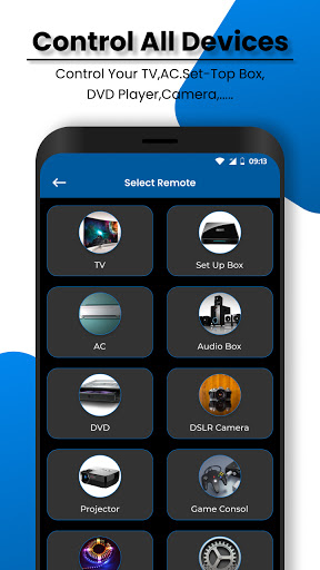 This app is an all-in-one remote control app that includes TV, Set-top box, AC, Camera, Projector, A/V Receiver, DVD Player, Fan, and Wifi system.