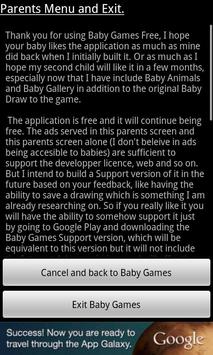 The app is free and supported by unobtrusive ads which will never appear in the main screen your baby will be interacting with as the ad is only shown on the Parent Menu and Exit screen, protected by a code.
