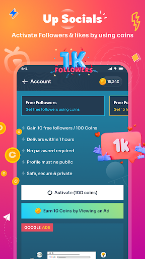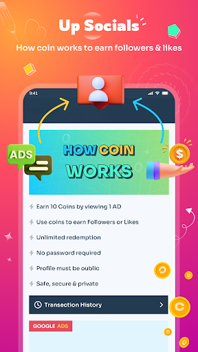 Earn 10 coins by viewing an ad, and get use it to earn free followers and likes.