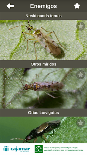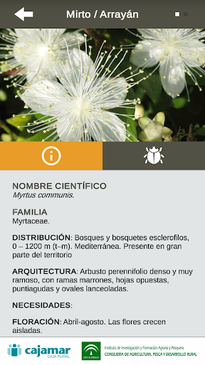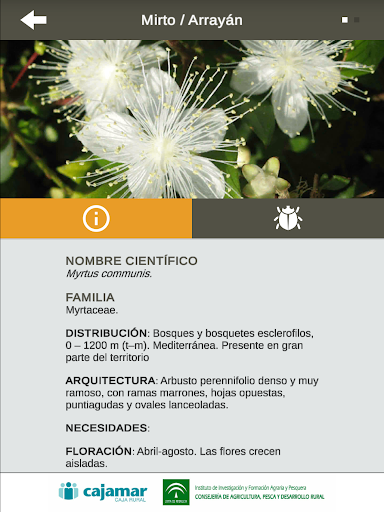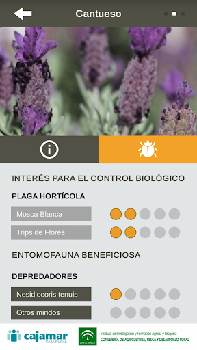 En esta aplicación se ofrece una descripción de las características de cada planta. Se describe también el interés de la planta para el control biológico, ofreciendo una relación de aquellos enemigos naturales observados en ellas durante los muestreos y de su abundancia. También se ofrece información sobre su atracción para dos de las plagas más relevantes de los cultivos, como son la mosca blanca (Bemisia tabaci) y trips (Frankliniella occidentalis) que pueden llegar a albergar. Esta APP también puede servir para buscar plantas en función de los enemigos naturales que quieras potenciar cerca de tus cultivos. Ofrece una descripción de los principales enemigos naturales encontrados en estas plantas, clasificados por grupos funcionales: depredadores o parasitoides con una pequeña descripción de la biología del auxiliar, cual es la plaga que controla, sobre qué plantas se puede encontrar y su abundancia.