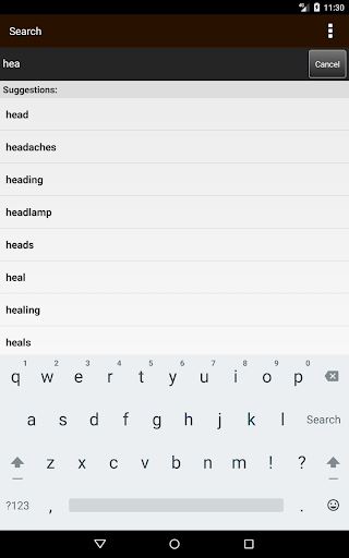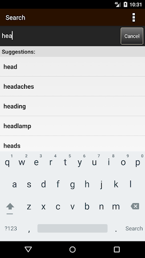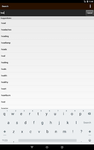 The Search tab only suggests words that appear in this content as you type to help spell long medical terms.