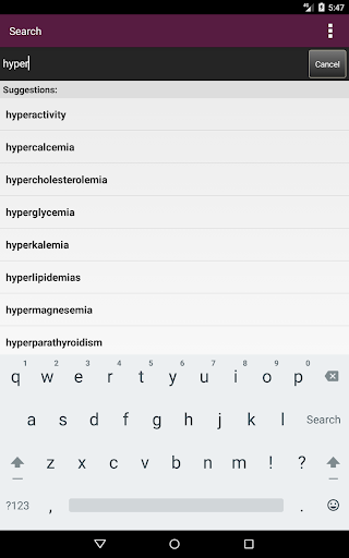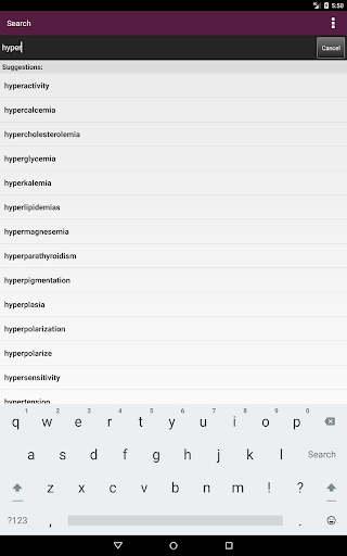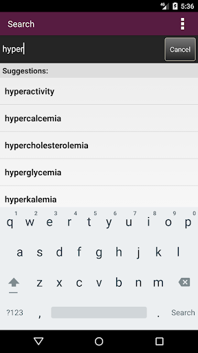 The Search tab only suggests words that appear in this content as you type to help spell long medical terms.
