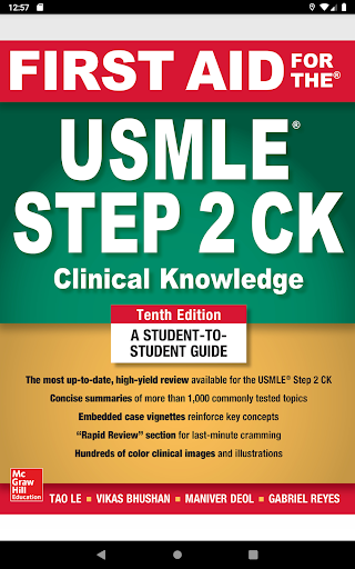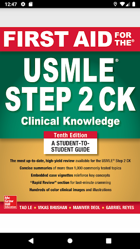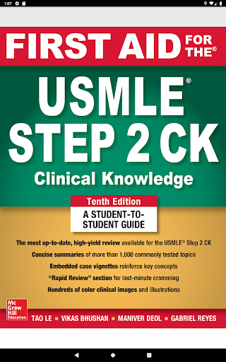 This interactive app contains the full content of First Aid for the USMLE Step 2 CK (Clinical Knowledge), Tenth Edition by McGraw-Hill Education.