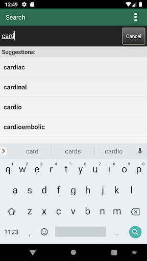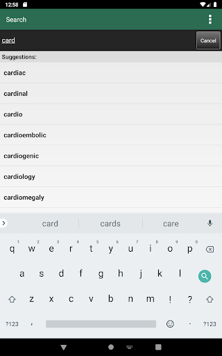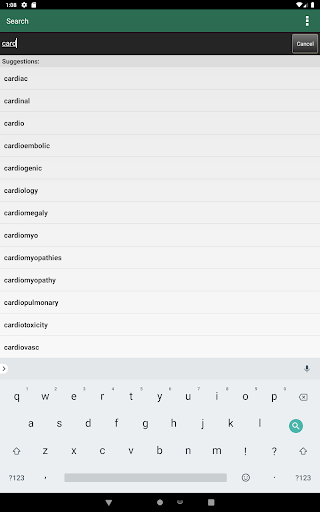 The Search tab only suggests words that appear in this content as you type to help spell long medical terms.