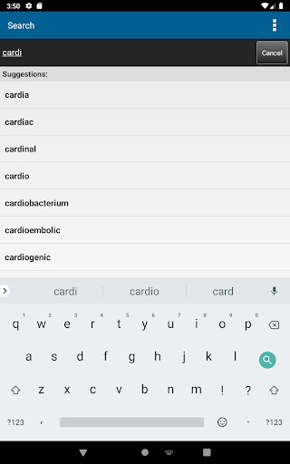 The Search tab only suggests words that appear in this content as you type to help spell long medical terms.