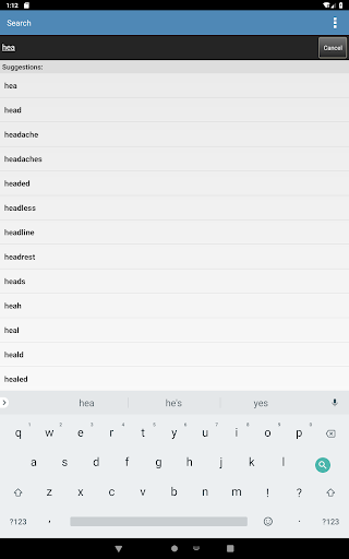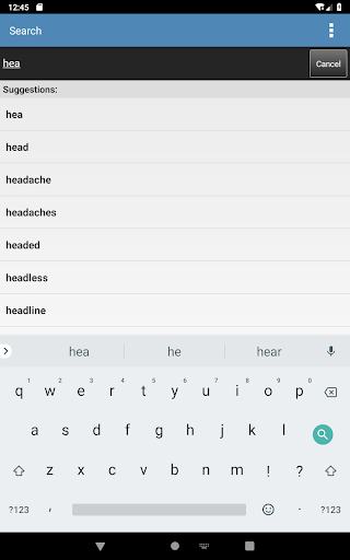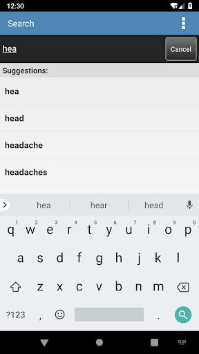The Search tab only suggests words that appear in this content as you type to help spell long medical terms.