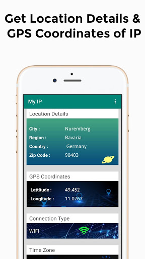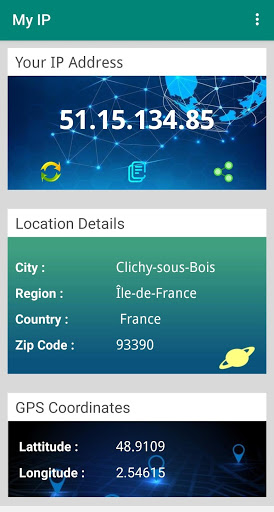 The app shows GPS Coordinates (Approximate Latitude and Longitude of your Current IP Address).