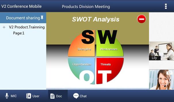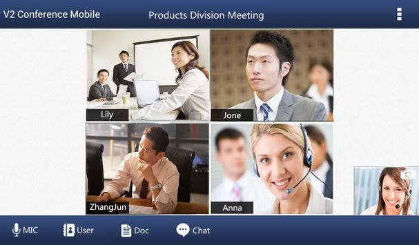 V2 Meet作為一款獨立的移動端產品,採用了全新的UI/UE設計,與原來的Conference移動客戶端相比,介面和操作更適合在移動設備上使用。V2 Meet支援多種類的移動設備,可以實現手機、Pad、智慧電視、機上盒之間的視訊會議交流。須搭配Conference 6.5.0.22或6.5.0.24版後台配合使用,V2 Meet可以實現會議預定、會議管理、會議邀請、會議控制、資料功能等完整的視訊會議功能。