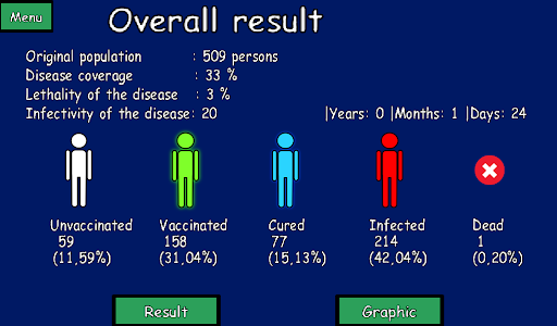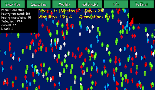 This program was created for educational purposes in order to illustrate the effect of vaccination in the prevention of infectious contagious diseases at the population level.