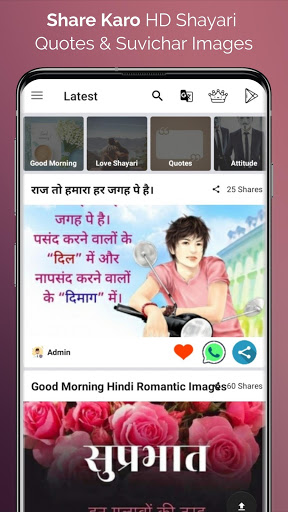 Express your mood with all types of Shayari, Quotes, Suvichar, and Status messages. Download HD images directly to your phone. Share or set status with just one tap. Find the perfect Hindi motivational quote to share with your loved ones through other social networking or instant messenger apps.
