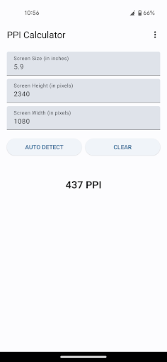 Easily calculate the PPI (Pixels Per Inch) of any device using this application. Features: - Auto-Detect screen resolution. - Built-In resolution presets. - Display accurate results with 4 decimal places.