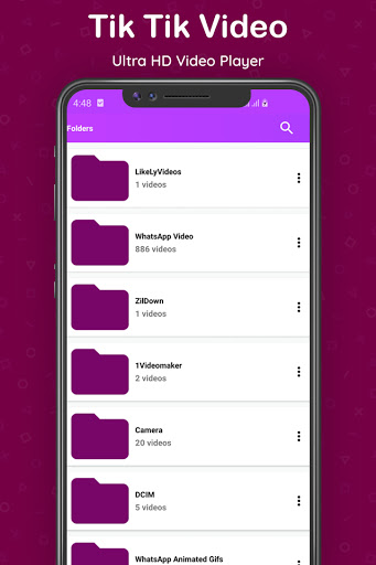 HD Tik Tik video player plays and supports all types of videos and audio files like AVI, 3GP, MKV, TS, MPG, M4V, MOV, MP4, WMV, RMVB, FLV, and MP3. You use this Free HD Tik Tik video player and click on videos and all videos in your mobile organized quickly.