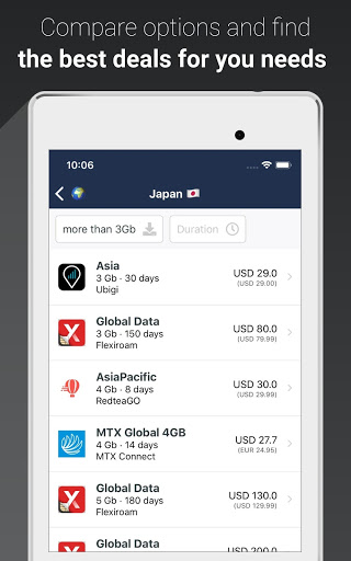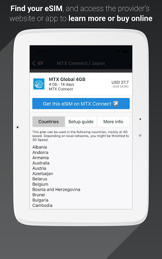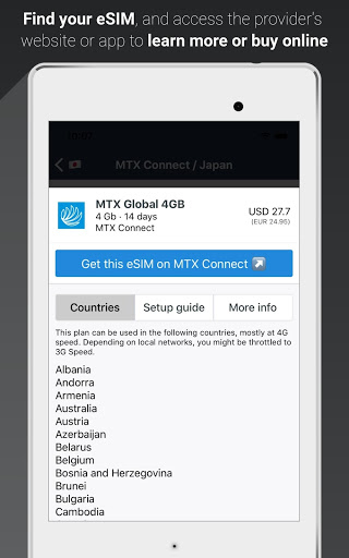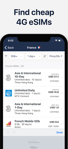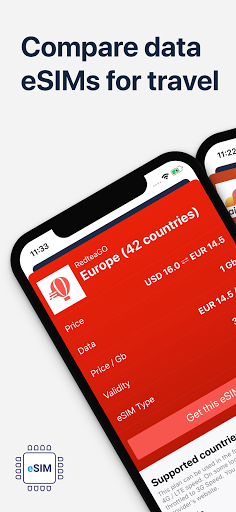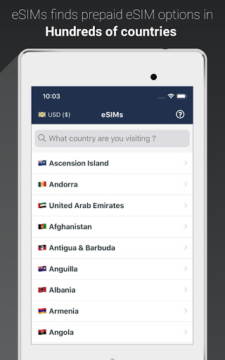 Find a prepaid data eSIM for your next trip abroad ! The eSIMs App compares prepaid eSIM offers from dozens of mobile operators in hundreds of countries, to help you find an affordable data plan and stay connected when you travel.