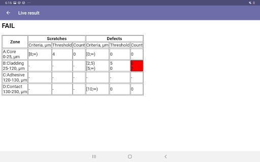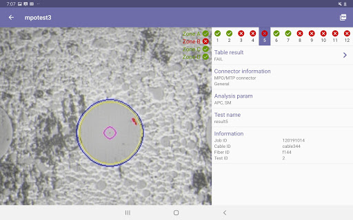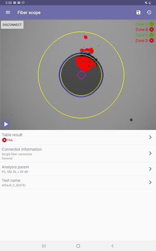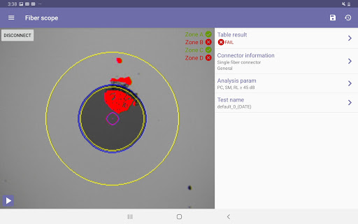 App designed to work with a variety of VeEX Fiberscopes (DI-3000, DI-1000, DI-1000MPO). View connector end faces for contamination, dents and/or scratches. Pass/Fail Analysis in accordance with IEC-61300-3-35 standards. Save images in .jpg files format.