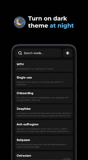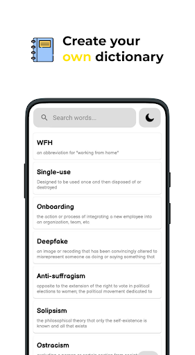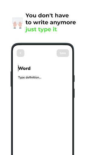 The application is made so simple that everyone can use it as a word saver, even schoolchildren or elderly people can understand how this application works. We didn't try to make the application complex with different functions and settings, the application is designed to simply save words like a regular dictionary or notebook that you use to write words. And don't think that if your word is not immediately added that it does not work, no, it was added if the word that was added is not displayed, just look for it in the search engine.