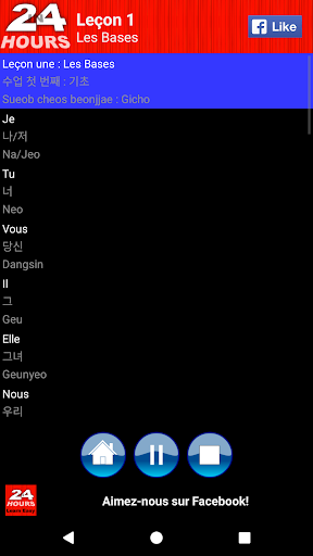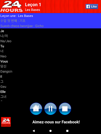Trop occupé pour s’inscrire à un cours de langue Coréen ou est-ce peut-être trop cher? Vous n’êtes pas seul et nous avons une solution. Cette application est conçue pour fonctionner avec votre style de vie! Grâce à la fonctionnalité audio de l’application, vous pouvez toujours apprendre lors de vos déplacements. Que ce soit en voiture, dans le bus, en train, durant un jogging dans un parc ou peut-être en vous relaxant dans votre lit, il suffit de brancher vos écouteurs et commencer à apprendre! Cette application vous propose le moyen le plus simple et le moins contraignant d’apprendre la langue Coréen!