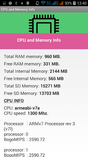 · CPU and Memory Info: CPU core type, numbers of processors, speed, RAM memory, SD memory, internal memory...