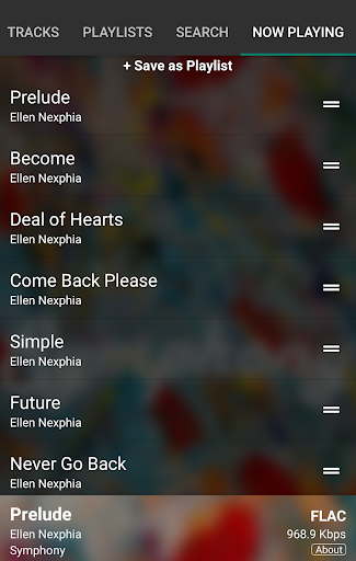 Choose available songs by its artist names, album names, track names, or from available playlists via each corresponding tab, even by searching it on the "Search" tab. All the chosen songs will be automatically on "Now Playing" tab.You can move each song`s play order in "Now Playing" tab by drag and drop it or you can remove it by just swipe it to the left. You can also save it as a playlist from "Now Playing" tab.