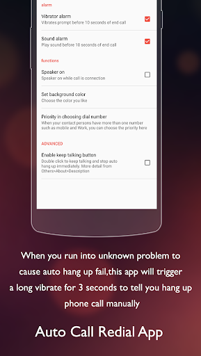- When you run into unknown problem to cause auto hang up fail,this app will trigger a long vibrate for 3 seconds to tell you hang up phone call manually.