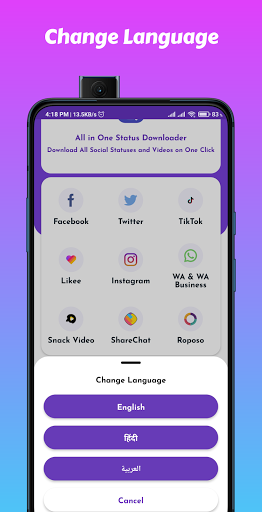 All in one status Saver is easy and helpful for those who wants to save their favorite image and video from WhatsApp, Tiktok, Likee, Instagram, Facebook, Twitter, SnackVideo, ShareChat and Roposo.