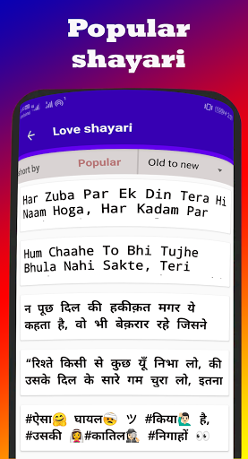 This app contains following category like Best wishes, Dosti, love, friendship, birthday, romance, hate, kiss, holi, diwali, nafrat and many more Shayari.