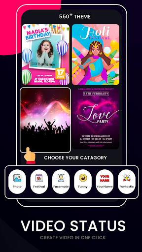 🤩 There is multiple video status category like love video status, sad video status maker, Navratri video status, Diwali video status maker app, attitude video status maker, Friendship video status, Happy birthday video status maker app with effects and styles.