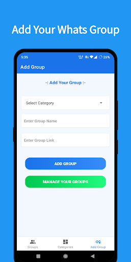 If you are a Group Admin and want to Share your Group Invite Link then you can do. You get the option "Add Your Group". After clicking on this option, you are able to add groups to the app. You need to give or submit the Group Name, Select Category, and Group Invite Link.