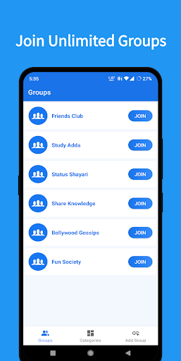 In This Active Whats Group App User Can Join Whats Groups And Chat With People. This App is Absolutely Free And Easy to use.
