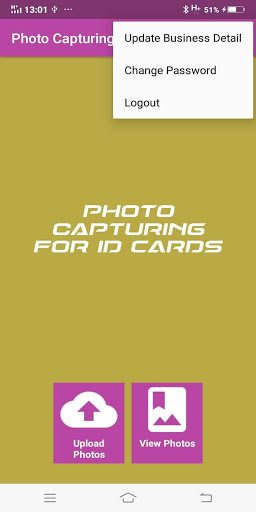 Capture photos for ID Cards, generate list of captured photos and pending photos. App is useful for capturing students photos for ID Cards. Photos captured are stored on the server from where the captured photos can be downloaded.