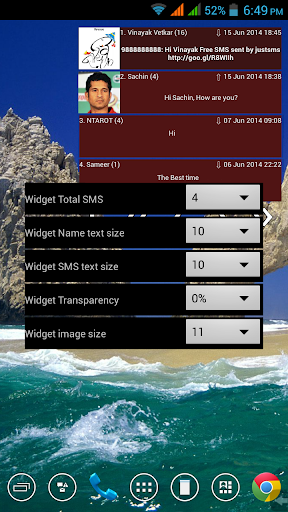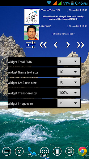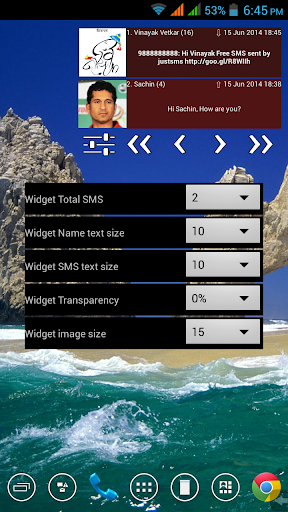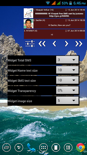 widget will show first (latest) sms of each thread with sender, time, sms and contact image (if available).