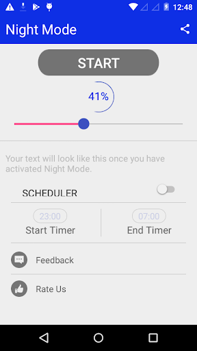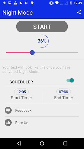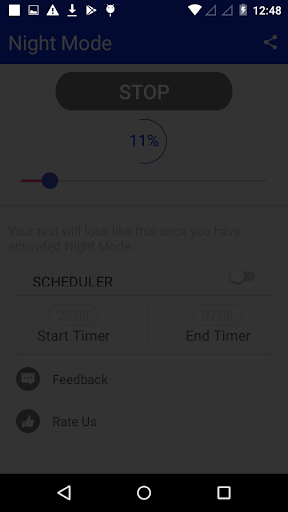 This application applies an overlay filter that acts as a dimmer to darken the screen. It helps to avoid headache and eye pain in a dark environment or at night.