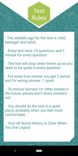 Based on your performance you will receive an IQ (Intelligence Quota) score. The IQ score is calculated based on number of true and false answers.
