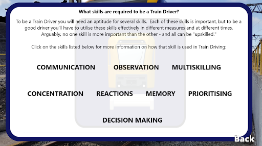 Within the app you will find out what skills are required to be a Train Driver. You will also be able to test and improve these skills.