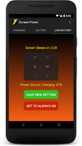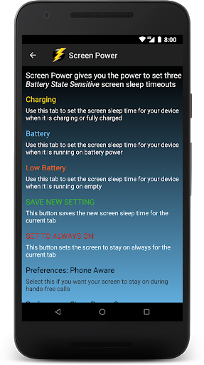 With three down-to-the-second power source specific screen off - screen sleep - screen timeout settings, Screen Power lets you maximize your on screen time and device battery life.