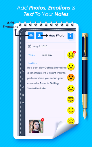 Diary is a simple application and allows you to write daily thoughts, whose having habit recording daily events, memorable movements, feelings, secrets of life, small notes and appointments. You can attach a smiley emotion or relevant pictures in notes.