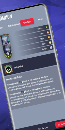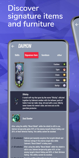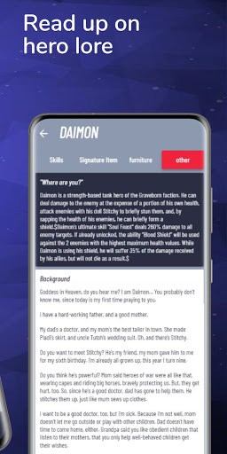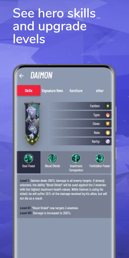 • Hero information including skills and their upgrade levels, furniture items, signature items and hero lore.