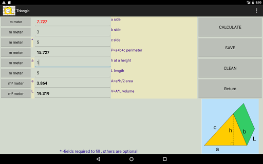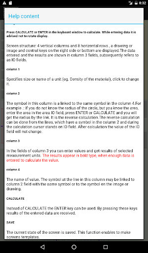 The application is defined by dynamic change of units. You can fill in one units of measurments and get the results in another selected units. There are about 300 units possible. Along with more complex calculations you will find a drawing.
