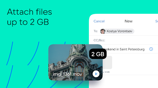 Sending large files. You can attach an entire movie or all photos from your vacation to an email: VK Mail agent can send files up to 2GB without compressing them and turning them into links.