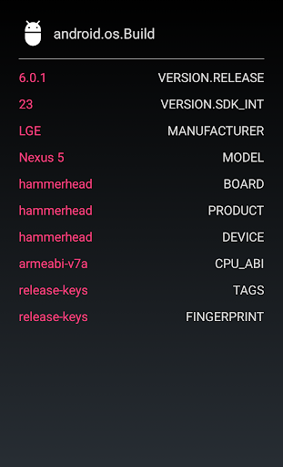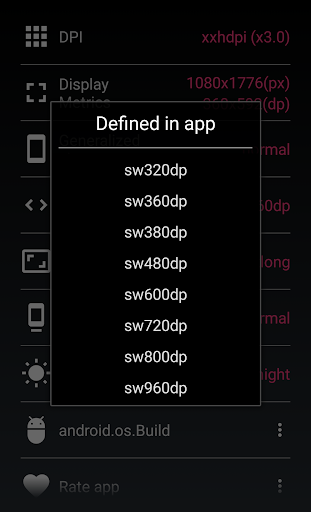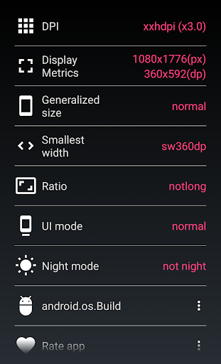 App shows: - Launcher Icon DPI - Smallest width - Density - Generalized size - Display Metrics (px & dp) - Ratio - android.os.Build