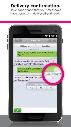 Voalte Me connects caregivers outside the hospital with Voalte One users inside the hospital. Using personal smartphones, care teams communicate and collaborate via cellular or Wi-Fi connections for access anytime, anywhere. Voalte Me gives doctors and other clinicians a HIPAA-compliant alternative to standard texting.