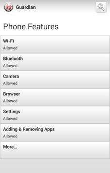 • Restrict or block functions including internet connection, bluetooth, calling, camera, video and apps.