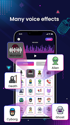 Voice Changers provides users with exciting voice avatars alike, namely robot voice, zombie voice, monster voice, alien voice, and others. Convert your sounds into those avatars and quickly send those changer pranks to your loved ones.