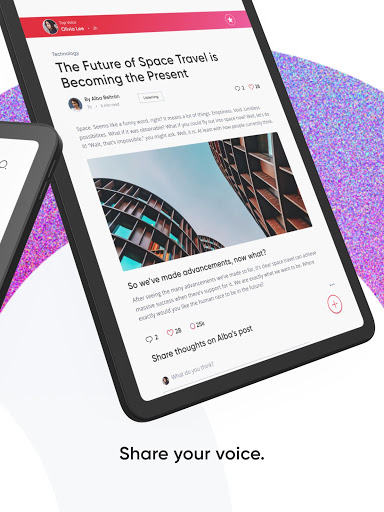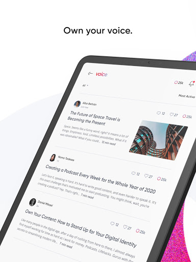 Unlike other platforms, Voice is bot-free and only allows one account per person. This way you can share your ideas, photos, articles, and stories with an engaged community of real people—no shadiness.