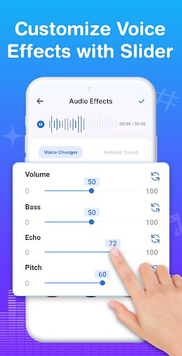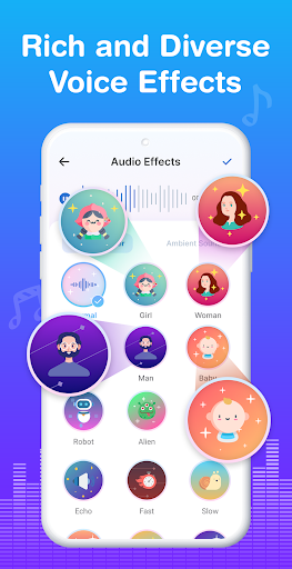 With just a few taps, your voice can be recorded, and applied audio effects. Record tracks in different voices, edit music, change the voice of Discord, calls, or videos - you can do all this easily without any preparation. Have fun with 100 voice and audio effects in Voice Changer, Audio Effects app. Download and enjoy these voice effects!