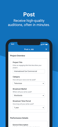 • Post your job and receive high-quality auditions (often in minutes) that bring your project to life.