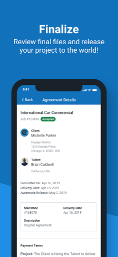 • Communicate confidentially through the app, review, and download final finals, and release your final project to the world.