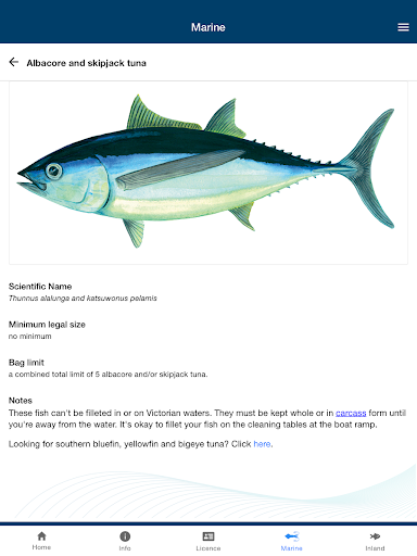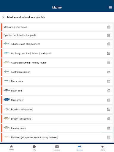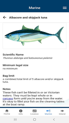 It describes size and bag limits, closed seasons and equipment restrictions. Other features include a direct link to purchase your fishing licence online, a licence outlet locator, connection to the 13FISH illegal fishing reporting line and a marine park/sanctuary boundary locator. This function uses the devices internal GPS to help fishers determine whether they are in or approaching a marine park or sanctuary.