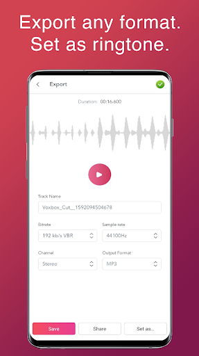 With the music cutter you can cut audio with an easy and handy UI cutter tools. This music trimmer will show you every information you need for best result. Zoom track for excellent audio cutting. Trim music and use it for device ringtone . Trim wav, trim mp3, trim AAC and so on